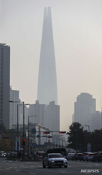 【NEWSIS】韓国の内陸地域を中心に濃い霧が立ち込めた31日、ソウル市松坡区のロッテワールドタワーも霧でかすんでいた。
