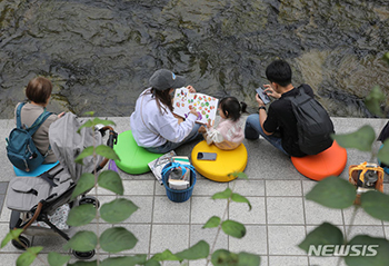 13日、ソウル市中区の清渓川に用意された「本を読む明るい川べり」ソウル野外図書館を訪れた市民が、読書をしつつ一休みしている様子。ソウル図書館は今月15日まで、清渓広場-毛廛橋-広通橋の区間に本のバス..