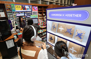 ソウル市麻浦区のコンビニ「CU AK&弘大店」で13日午後、ボーイズグループTOMORROW X TOGETHERの3rdフルアルバムを買うため並んで待っている人々の様子。
