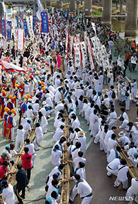 【NEWSIS】「第29回東莱邑城歴史祭り」が始まった14日、釜山市東莱区の東莱駅に近い人工滝で、東莱三本綱引きが行われた。15日まで開催される今回の東莱邑城歴史祭りは、東莱文化会館・東莱邑城広場・..