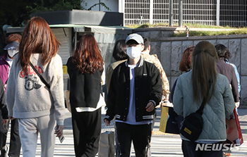 肌寒い朝を迎えた16日午前、仁川市南洞区の仁川市南洞区で横断歩道を渡る市民たちの様子。気象庁は、朝の最低気温が5-16度、昼間の最高気温は18-23度で、昼と夜の気温差が10-15度と大きくなるとの..