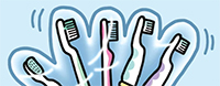 旅行の荷物をつめるとき、家族分の歯ブラシを使い捨てのビニール手袋に入れておくとすっきりする。指を入れる部分にそれぞれ歯ブラシを入れておけばよい。