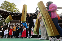 28日、ソウル市中区の「韓国の家」で開かれた「秋夕(中秋節。今年は9月29日)名節クンジャンチ」に参加した市民や外国人が、ユンノリ(すごろく)大会を楽しんでいる。