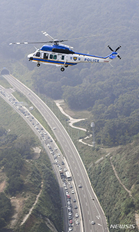 秋夕(中秋節。今年は9月29日)名節交通法規違反車両地空協力取り締まりが行われた28日午前、京畿道竜仁市の嶺東高速道路上空で、警察ヘリが高速道路の法規違反行為車両の取り締まりを行っている様子。
