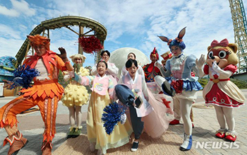 秋夕(チュソク=中秋節、今年は9月29日)連休を三日後に控えた25日、釜山市機張郡のロッテワールド・アドベンチャー釜山で、韓服(韓国の伝統衣装)を着たコンパニオンや外国人キャストたちが民俗遊びを体験..