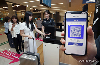 仁川空港税関の職員たちが25日午前、仁川国際空港第2旅客ターミナルの入国ロビーでモバイル申告システムを実演した。