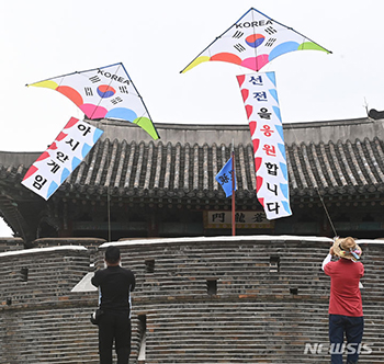 【NEWSIS】杭州アジア大会が開催されている25日、水原華城(京畿道水原市)の蒼龍門では、韓国たこ連盟のメンバーたちが、韓国代表選手らの健闘を祈ってたこを揚げている。