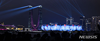 第19回アジア競技大会(2022/杭州。2023年開催)が開幕した23日、杭州オリンピックスポーツセンターのスタジアム一帯で、開幕を告げる華麗なライトショーが行われている様子。