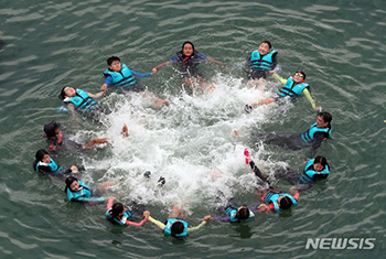 【NEWSIS】釜山市の余古小学校の児童が18日午前、広安里海水浴場で生存水泳を学んだ。釜山市の東莱教育支援庁は今週、管内の小学校3校の5・6年生約100人を対象に、広安里海洋レポーツセンターで「小..