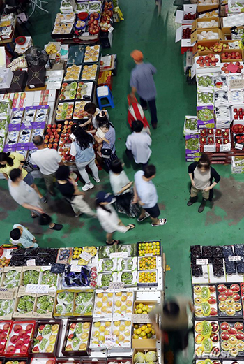 【NEWSIS】秋夕(チュソク=中秋節)連休(今年は9月28-30日)まであと約十日となった16日、釜山市海雲台区の盤如農産物卸売市場は祭祀(さいし)用や贈答品用の果物を買い求める市民たちでにぎわっ..