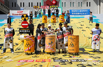 環境運動連合をはじめとする環境団体のメンバーらが18日午前、ソウル市鍾路区の世宗文化会館前の階段で、日本の福島汚染水放流中止と日本製品不買を求め、日本産のビールを放射性廃棄物のドラム缶に注ぐパフォーマ..