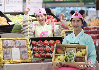 18日午前、ソウル市竜山区の大手スーパー「Eマート竜山店」で、秋夕(中秋節。今年は9月29日)のギフトセットを披露するコンパニオンの様子。Eマートは今月19日から秋夕当日の29日まで、韓国各地の売り場..