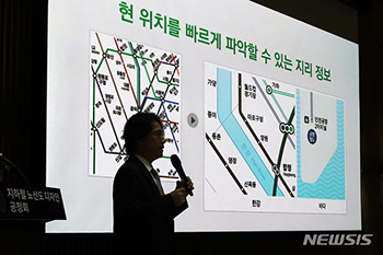 ソウル市中区のソウル市庁多目的ホールで18日に開かれた地下鉄路線図デザイン公聴会で、ソウル市のチェ・インギュ・デザイン制作官が地下鉄路線図デザインの発表を行っているところ。