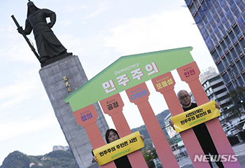 国際民主主義デーを翌日に控えた14日午前、ソウル市鍾路区の李舜臣(イ・スンシン)像の前で、国際環境保護団体グリーンピースのメンバーたちがパフォーマンスを繰り広げた。
