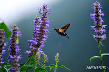 秋の到来を促す雨天となった14日午後、慶尚南道南海郡南海邑の郊外では、蛾のクロホウジャクが野草のカワミドリの周りを飛びながら蜜を吸っていた。