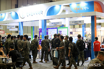 13日、京畿道高陽市のKINTEXで開かれた2023下半期国軍将兵就職博覧会にて、会場を訪れた韓国軍将兵らが就職相談を受けている様子。