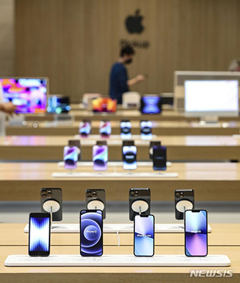 Appleのスマートフォンシリーズ「iPhone 15」が公開された13日、ソウル市中区のアップルストア明洞店に展示されたiPhoneシリーズの様子。