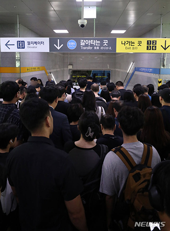 【NEWSIS】全国鉄道労働組合がストライキに突入する14日午前、乗換駅の源仁斎駅(仁川市延寿区)の様子。韓国鉄道公社が運行する水仁線に乗ってきた乗客たちが仁川交通公社1号線に乗り換えるため、混雑す..