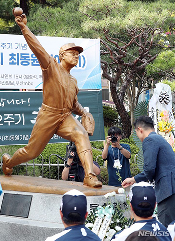 【NEWSIS】釜山市東莱区の社稷野球場で12日、プロ野球選手として活躍した故・崔東原(チェ・ドンウォン)さん(1958-2011)の死去12年の追悼行事が行われた。写真は、球場の広場に立つ崔東原さん..