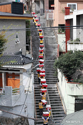 急な階段を上がるボランティアたち、秋夕の温情を届ける