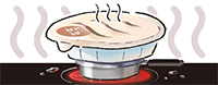 パックご飯の容器の上下に切れ目を入れ、小さな鍋の上に置き、お湯を沸かせば、水蒸気の熱でご飯を温めることができる。