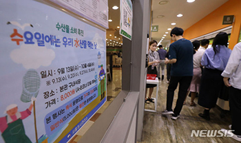 郵政事業本部のパク・インファン本部長職務代理や職員たちが12日午前、ソウル市中区のソウル中央郵便局で行われた郵便局ショッピング「秋夕(チュソク=中秋節、今年は9月29日)水産物特別割引大展」で韓国産..