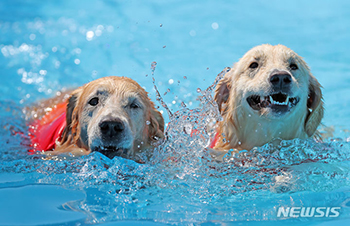 ソウル市広津区のトゥクソム漢江公園内の愛犬プールで7日、イヌたちが水遊びをしている様子。市の集計によると、今月24日まで運営される愛犬プールには、今月2日から5日までの四日間で計409人の利用者と29..