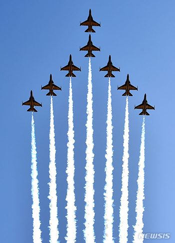 慶尚北道亀尾市のGUMICO上空で7日、韓国空軍の特殊飛行チーム「ブラックイーグルス」が2023年慶尚北道航空防衛物流博覧会の開催を記念し、祝賀飛行を繰り広げた。