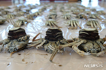 7日午前、蔚山市南区の蔚山海洋警察署2階の大講堂で、蔚山海洋警察が押収した違法漁獲物(雌ズワイガニ)が公開された。