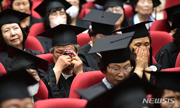 6日、大邱市教育庁幸福館で開かれた「大邱 あしたの学校初等第11回・中学第8回卒業式」に出席して涙をぬぐう卒業生らの様子。「あしたの学校」は、学びの機会を逃した成人のために、大邱市教育庁が初等・中学学..