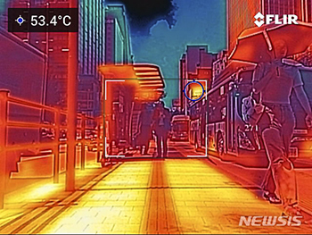 6日、ソウル市鍾路区にて、中央バス専用レーン(BRT)のバス停留所が熱画像カメラで赤く表示されている様子。韓国のある環境団体によると、今年8月にソウルの中央バス専用レーン(BRT)のバス停留所5カ所を..