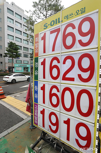 【NEWSIS】最近、国際原油価格が上がっていることから、韓国国内のガソリン価格も2カ月連続で上昇傾向にある。写真は3日、ソウル市内のあるガソリンスタンドに掲示されたガソリン、軽油、灯油、ハイオクの..