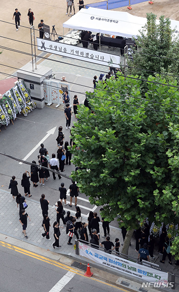 【NEWSIS】ソウル市瑞草区の瑞二小の教師が自死した事件に関連し、今月4日の午後、瑞二小で教師の四十九日の追悼式が行われた。写真は学校の外まで列をつくる参列客。