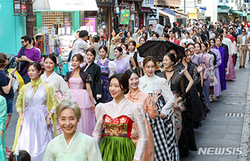 2023仁寺洞アンティーク&アートフェアが開幕した31日午後、ソウル市鍾路区の「アンニョン仁寺洞」で、モダン韓服パレードが行われている様子。