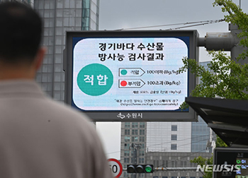 日本の福島原発汚染水放流が始まって六日目になる30日、京畿道水原市勧善区の電光板に、放射能検査の結果現況の案内が表示されている様子。