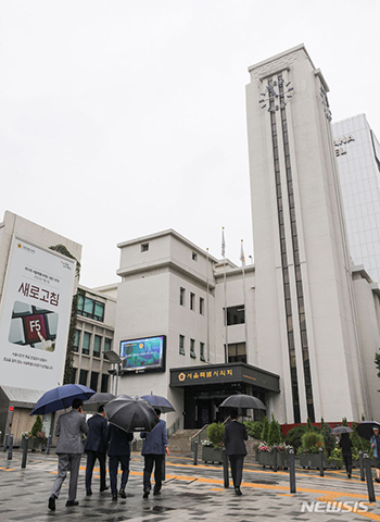 韓国各地に雲がかかって雨が降った28日、京畿道水原市八達区の京畿道庁旧庁舎で、雨傘を差して歩く市民の様子。
