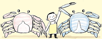 秋はオスのワタリガニの旬だ。オスのワタリガニは腹の殻の形がとがっている。手に持った時ずっしりしていて、腹の部分が硬いカニを選ぼう。