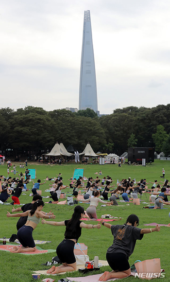 【NEWSIS】27日午後、ソウル市松坡区のソウルオリンピック公園88広場で、ウェルネス・フェスティバル「WANDERLUST KOREA(ワンダーラスト・コリア)2023」が行われた。写真はヨガの..