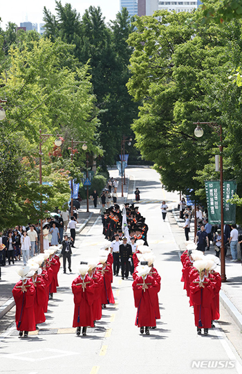 ソウル市内の成均館大学で25日、2023年夏季学位授与式および卒業式に当たる「告由礼」が行われ、舞踊学科の学生たちや卒業生たちが600周年記念館へと移動する様子。