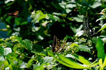 連日暑さが続く26日午前、慶尚南道南海郡南海邑付近の郊外では、ハチとアゲハチョウが花の蜜を吸っていた。