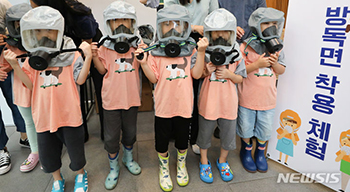 乙支訓練最終日の24日、ソウル市瑞草区庁のロビーで行われた「瑞草区乙支練習安保体験イベント」で、子どもたちが化学・生物・放射能に備える防毒マスク着用体験に臨んだ。今回のイベントは、瑞草区が乙支訓練の..