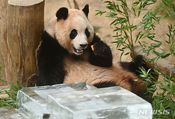 エバーランド(京畿道竜仁市)のパンダワールドで24日、元気に夏を過ごす子どもパンダの「フーバオ(福宝)」が、飼育士らの準備した氷の特別メニューを食べている様子。