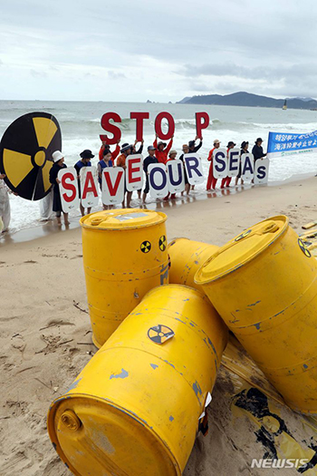 日本が福島原発汚染水海洋放流を開始した24日、釜山市海雲台区の海雲台海水浴場で環境運動連合海委員会など複数の環境団体・市民団体の活動家らが、黄色のビニールなどを用いて原発の汚染水が釜山沖に押し寄せるこ..