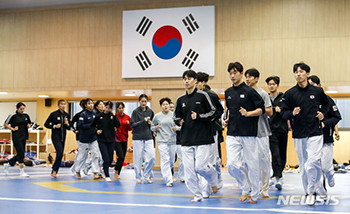 杭州アジア大会まであと1カ月と迫った24日、鎮川国家代表選手村(忠清北道鎮川郡)でトレーニングをしているテコンドー韓国代表の選手たち。