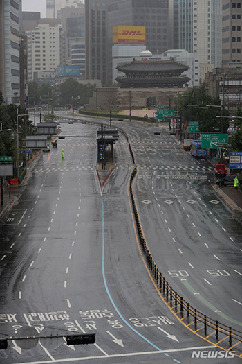 空襲に備えた民防衛訓練が実施された23日午後、ソウル市中区の世宗大路は、車両移動規制訓練でがらんと空いていた。