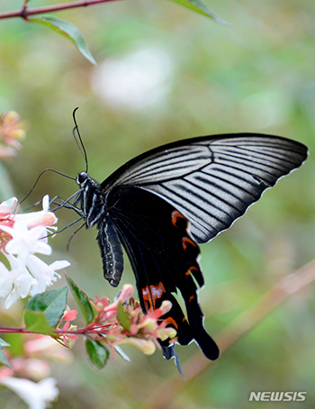 23日午後、慶尚南道南海郡二東面の道端で、1羽のカラスアゲハがアベリアの花の周りを飛び回り、蜜を吸っている。