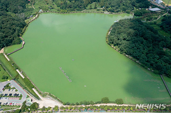 猛暑が続いている17日午後、光州市西区の楓岩湖水公園でアオコが発生し、水が緑色に変色している様子。