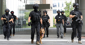 韓国国税庁で爆発物を捜索する警察特殊部隊