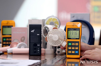 【NEWSIS】11日午前、ソウル市鍾路区の環境保健市民センターで、「生活中の電磁波発生および露出実態調査」の発表記者会見が行われた。写真はハンディファン(携帯扇風機)の電磁波測定結果を示す同センタ..