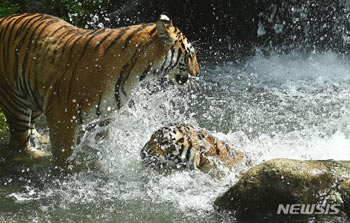 韓国の大部分の地域に猛暑警報が発令された28日、エバーランド(京畿道竜仁市)の「タイガー・バレー」では、チョウセントラが滝で暑さを紛らわせていた。あすは、トラが絶滅の危機にあることをアピールし、保全意..